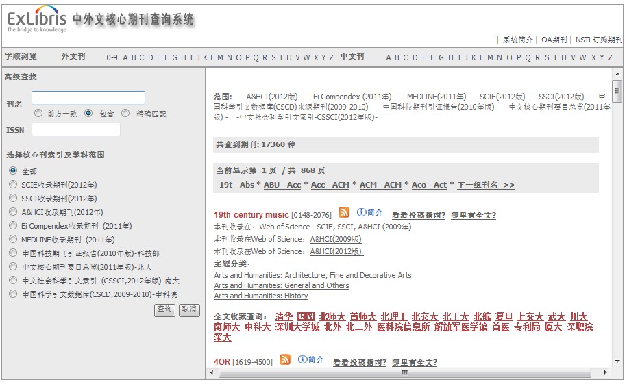 1,可以查詢某刊物是否被[SCI, SSCI, A&HCI, EI, MEDLINE]等數(shù)據(jù)庫檢索,檢索的時間,可以查詢刊物影響因子,以及國內(nèi)哪些高校或科研單位購買或者擁有該數(shù)據(jù)庫入口等期刊信息;